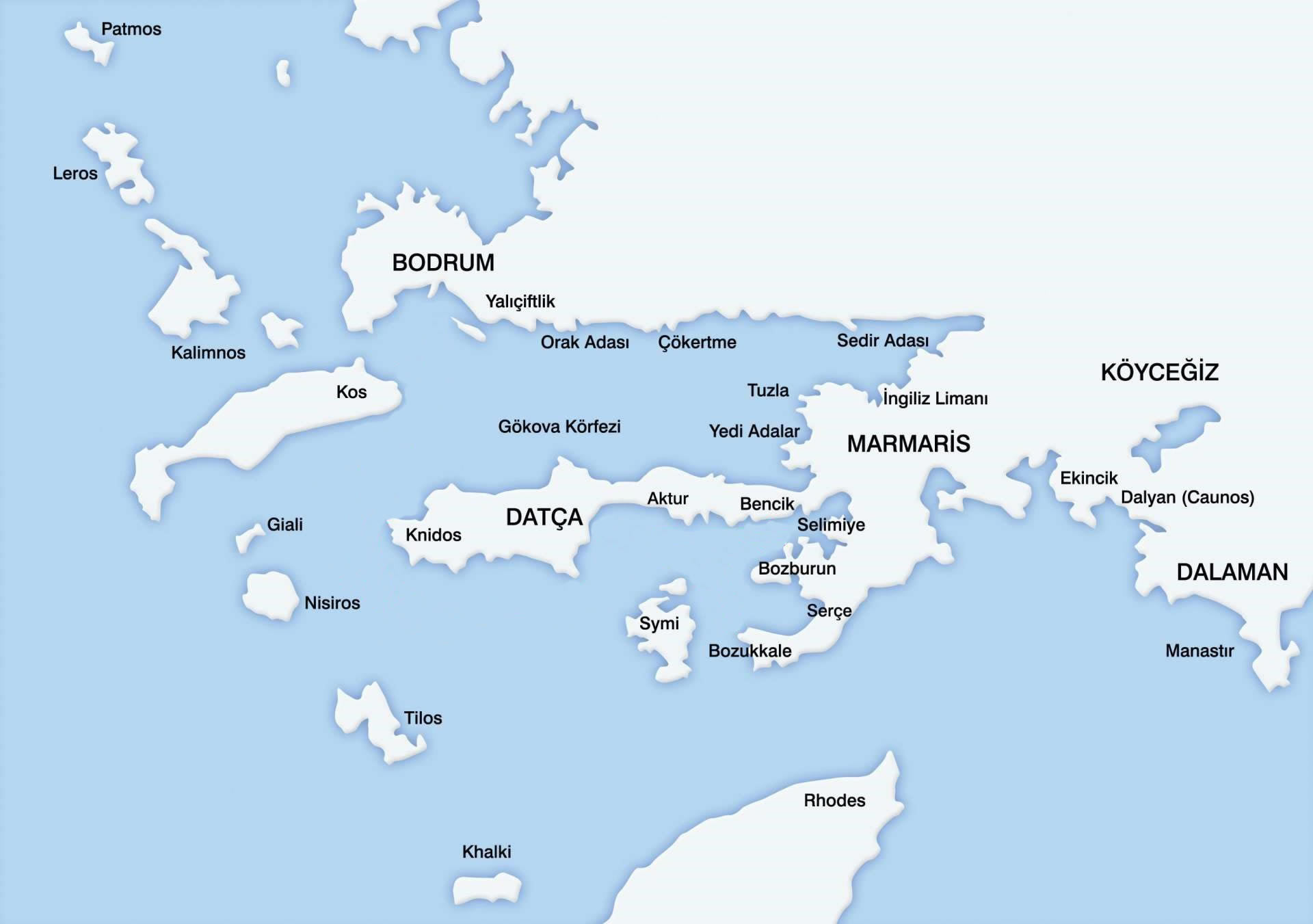 BODRUM – ORAK ADASI – ÇÖKERTME KOYU – 7 ADALAR – İNGİLİZ LİMANI – KLEOPATRA ADASI – KARACA SÖĞÜT – LÖNGÖZ KOYU – TUZLA KOYU – KARGILI KOYU– KİSEBÜKÜ KOYU- PABUÇ BURNU – YALIÇİFTLİK – BODRUM